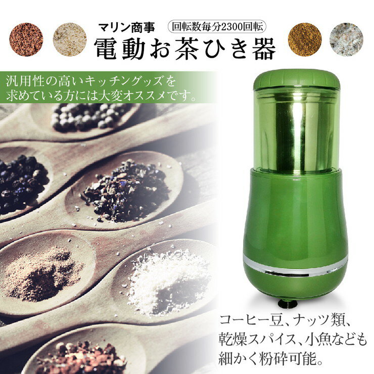 いつも飲んでるお気に入りの緑茶を粉末にできる、電動お茶挽き器セット内容:本体、上ぶた、中ぶた、グラインドカップ、はけ本体サイズ:幅14×奥行14×高さ26.5cm本体重量:1.2kg回転数:毎分(約)2300回転電源:AC100V消費電力:300Wコード長:100cm連続使用時間:3分(3分使ったら15分休ませて使用してください)生産国:中国【代引きについて】こちらの商品は、代引きでの出荷は受け付けておりません。